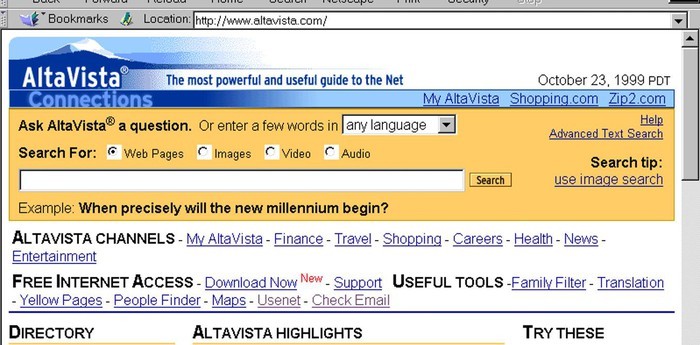 Giao diện của AltaVista, một trong những công cụ tìm kiếm thuở xưa.