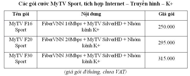 Theo đó, MyTV Sport sẽ cung cấp gần 200 kênh truyền hình trong nước và quốc, bao gồm cả bộ kênh K+ với giá chỉ 150.000đ/tháng, đặc biệt cạnh tranh trên thị trường. Đăng ký gói cước F16 Sport được tích hợp sẵn đường truyền Internet cáp quang FiberVNN 16Mbps, giá cước thậm chí còn ưu đãi hơn, chỉ 250.000đ/tháng cho tất cả dịch vụ kể trên.