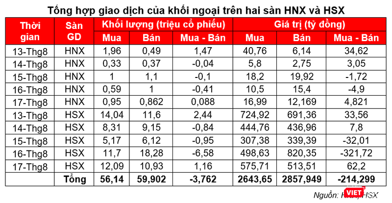 Trên 2 sàn HNX và HSX, giá trị giao dịch ròng của nhà đầu tư nước ngoài giảm mạnh và có diễn biến trái chiều nhau. Ở trên sàn HNX, nhà đầu tư nước ngoài mua ròng hơn 1 triệu cổ phiếu, giá trị giao dịch ròng đạt 35,85 tỷ đồng. Trong khi đó, nhà đầu tư nước ngoài bán ròng 4,77 triệu cổ phiếu, tương đương với giá trị bán ròng đạt 214,3 tỷ đồng.