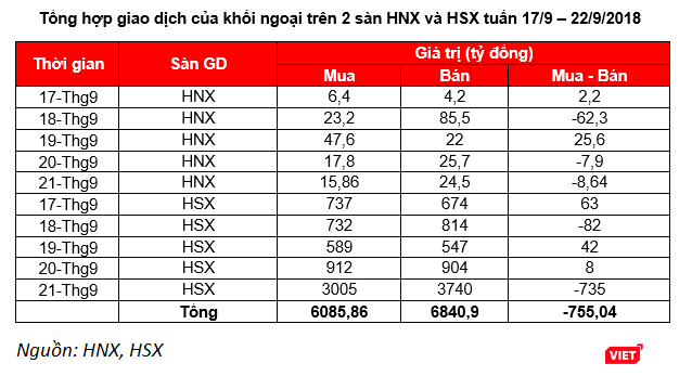 Tuần qua, nhà đầu tư nước ngoài có tuần bán ròng trên cả hai sàn với tổng giá trị là 755,04 tỷ đồng, tập trung phần lớn vào phiên giao dịch cuối tuần ngày 21/9/2018.