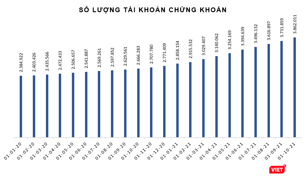 Với 3,81 triệu tài khoản chứng khoán đứng tên các cá nhân trong nước tính đến hết tháng 10/2021, tỷ lệ tài khoản chứng khoán trên dân số của Việt Nam đạt mức 3,9%, áp sát Thái Lan (5,0%) và bỏ xa Indonesia (1,0%), Philippines (1,3%).