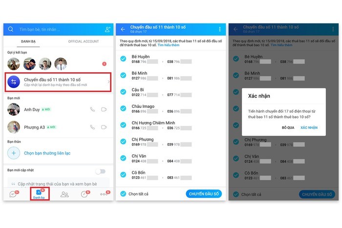 Để chuyển đổi, người dùng chỉ cần thực hiện truy cập mục Danh bạ trong Zalo > Chuyển đầu số 11 số thành 10 số > chọn số > Chuyển đầu số > Xác nhận.