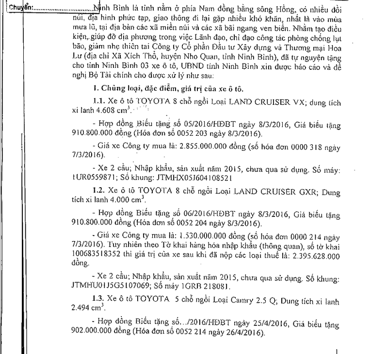 Đúng như văn bản mà UBND tỉnh này gửi lên Bộ Tài chính thì 02 chiếc Land Cruiser VX và Land Cruiser GXR cùng được tặng vào ngày 08/03/2016; còn chiếc Toyota Camry 2.5Q lại được tặng vào ngày 26/04/2016 – căn cứ theo Hợp đồng Biếu tặng.
