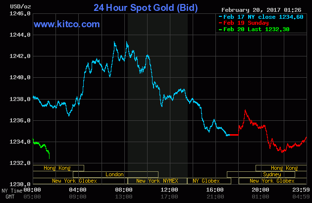 Chốt phiên giao dịch cuối tuần trước (Thứ Sáu ngày 17/2/2017), giá vàng giao tháng Tư trên sàn Comex tại Sở Giao dịch New York Mercantile trôi thấp $2,50 (-0,2%) xuống chốt tại $1.239,10/oz – tuy vẫn quanh quẩn quanh mức đỉnh 3 tháng vừa lập vào phiên Thứ Năm, căn cứ theo dữ liệu của FactSet. Tính chung cả tuần, giá vàng đã tăng 0,3% - đánh dấu tuần đi lên thứ 3 liên tiếp.