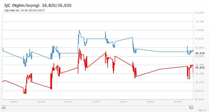 Trong khi đó, tại các đại lý của Doji, giá vàng miếng SJC lại được tập đoàn này điều chỉnh tăng khẽ 10 nghìn đồng lên yết ở 36,82 – 36,92 triệu đồng/lượng (MV-BR) đối với giao dịch lẻ; và đắt hơn 10 nghìn đồng chiều mua, đồng thời rẻ hơn 10 nghìn đồng chiều bán đối với giao dịch buôn ở thị trường Hà Nội. Theo đó, doãng chênh lệch 2 chiều mua - bán ở Doji đang là 100 nghìn đồng/lượng.