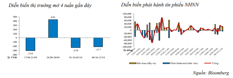 Ở chiều hướng ngược lại, trên kênh thị trường mở (OMO), NHNN không có hoạt động bơm mới, trong khi đó lượng vốn đáo hạn qua kênh này đạt 217 tỷ đồng. Như vậy, NHNN đã hút ròng 217 tỷ đồng qua kênh này.