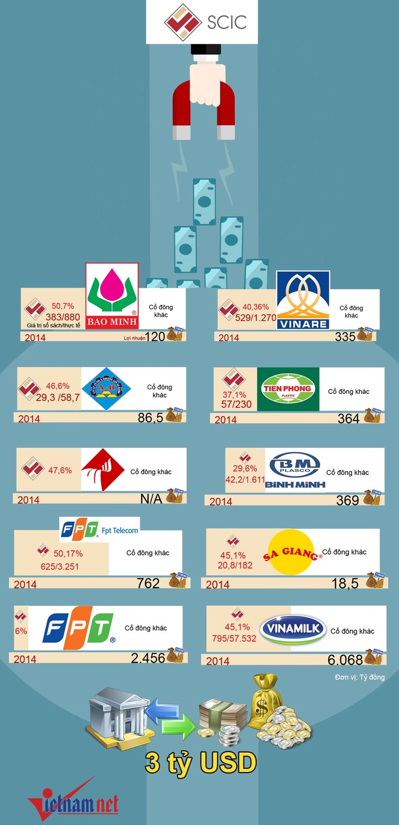 Dưới đây là thông tin cổ phần nắm giữ của SCIC tại các doanh nghiệp, tỷ lệ vốn nhà nước nắm giữ trên sổ sách và thực tế, lợi nhuận doanh nghiệp năm 2014.