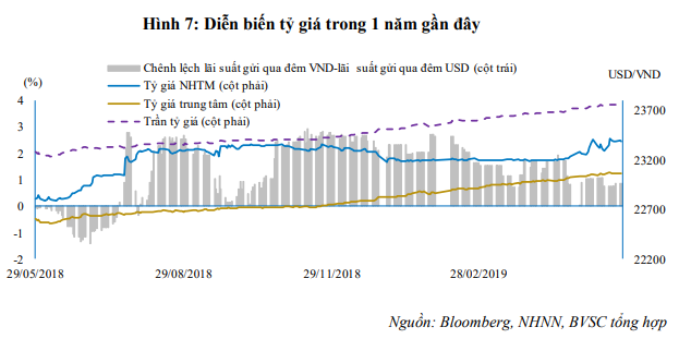 Nhân định về việc tỷ giá tăng tương đối mạnh từ đầu tháng 5 tới nay, BVSC cho biết nguyên nhân có thể đến từ căng thăng thương mại Mỹ - Trung leo thang và việc Việt Nam đã nhập siêu 1,85 tỷ USD (theo số liệu của Tổng cục Hải quan) kể từ đầu năm 2019 tính đến ngày 15/5.