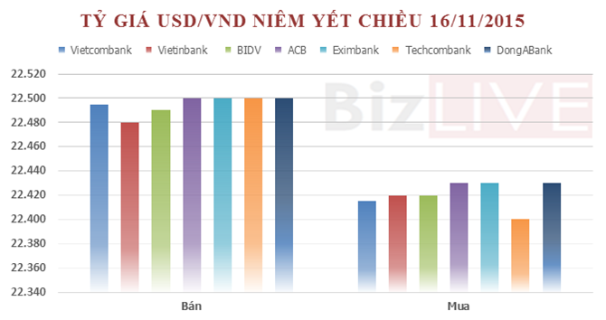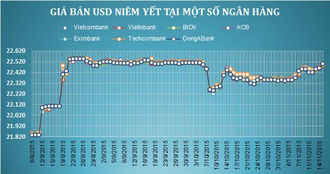 Trong khi đó, các ngân hàng ACB, Eximbank và DongABank đang cùng mua bán USD với giá 22.430-22.500 đồng, trong đó, ACB và Eximbank cùng tăng 20 đồng, riêng DongABank tăng tới 40 đồng so với giá niêm yết lúc đầu giờ sáng nay.