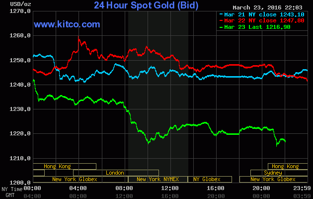 Chốt phiên giao dịch Thứ Tư (ngày 23/03), giá vàng giao tháng Tư trên sàn Comex tại Sở giao dịch New York Mercantile nối đà trôi sâu $24,60 (-2%) xuống đóng cửa ở $1.224,30/oz, thấp nhất kể từ ngày 26/2 – theo số liệu của FactSet.