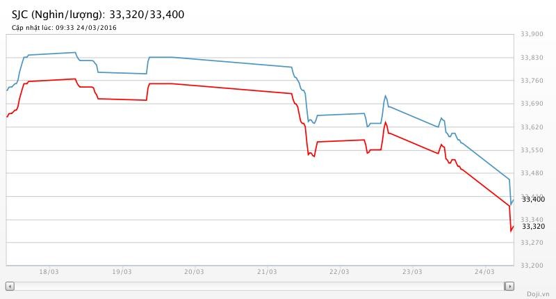 Tương tự, tại các đại lý Doji, giá vàng miếng SJC cũng được Tập đoàn điều chỉnh giảm 170 nghìn đồng về đứng ở 33,32 – 33,40 triệu đồng/lượng (MV-BR) đối với giao dịch lẻ; và đắt hơn 10 nghìn đồng chiều mua, đồng thời rẻ hơn 10 nghìn đồng chiều bán đối với giao dịch buôn ở thị trường Hà Nội. Với biểu giá này, doãng chênh lệch 2 chiều mua – bán vàng SJC tại Doji vẫn là 80 nghìn đồng/lượng.