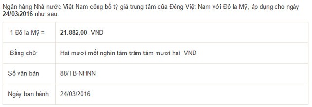 Trong khi đó, trên thị trường ngoại hối, tỷ giá USD/VND lại vẫn tăng khá mạnh.Vietcombank – nhà băng luôn yết giá ngoại tệ cạnh tranh nhất thị trường chính thức, đang chào giá USD ở mức 22.310-22.380 đồng/USD (MV – BR), tăng tiếp 10 đồng so với sáng qua. Trước đó, trong một động thái định hướng thị trường, NHNN cũng công bố tỷ giá trung tâm của Đồng Việt Nam với Đô la Mỹ, áp dụng cho ngày 24/3/2016 là 21.882 đồng, tiếp tục tăng 21 đồng so với hôm qua, và nới doãng tăng của tỷ giá trung tâm trong tuần này lên mức 44 đồng.