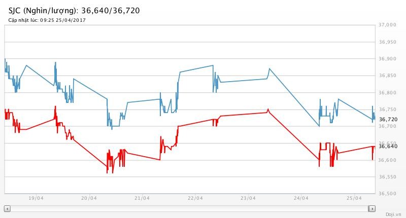 Tại các đại lý của Doji, giá vàng miếng SJC đã được tập đoàn này điều chỉnh tăng 20 nghìn đồng chiều mua nhưng lại giảm 60 nghìn đồng chiều bán so với chốt phiên trước đó, về yết ở 36,64 – 36,72 triệu đồng/lượng (MV-BR) đối với giao dịch lẻ và đắt hơn 10 nghìn đồng chiều mua, đồng thời rẻ hơn 10 nghìn đồng chiều bán đối với giao dịch buôn ở thị trường Hà Nội. Như vậy, chênh lệch 2 chiều mua - bán ở Doji hiện là 80 nghìn đồng/lượng.