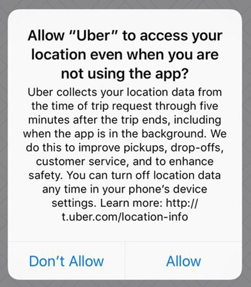 Theo trang tin NPR, thay đổi này của Uber được thực hiện một cách công khai. Sau khi cài xong bản cập nhật, người dùng sẽ được hỏi có chấp nhận chính sách mới của Uber hay không. Trước đây, Uber chỉ thu thập dữ liệu của khách hàng khi ứng dụng Uber trên điện thoại của họ đang mở. Bây giờ, Uber sẽ tiếp tục dõi theo bước chân khách hàng khi ứng dụng đóng lại và ở chế độ chạy nền. Điều này giúp cho Uber có thể biết được vị trí chính xác nơi khách hàng tới sau khi rời khỏi xe.