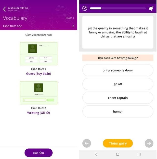 Với bài học từ vựng (Vocabulary), ứng dụng cung cấp cho 2 hình thức học, bao gồm kiểu đoán từ (ứng dụng sẽ cung cấp một định nghĩa bằng tiếng Anh, người dùng cần phải đoán được từ tương ứng với định nghĩa đó) hoặc kiểu viết (bạn phải tự viết ra từ cần đoán, thay vì có sẵn đáp án như hình thức đoán từ ở trên). Với những người mới bắt đầu, bạn nên chọn hình thức đoán từ, thay vì kiểu viết phức tạp hơn.