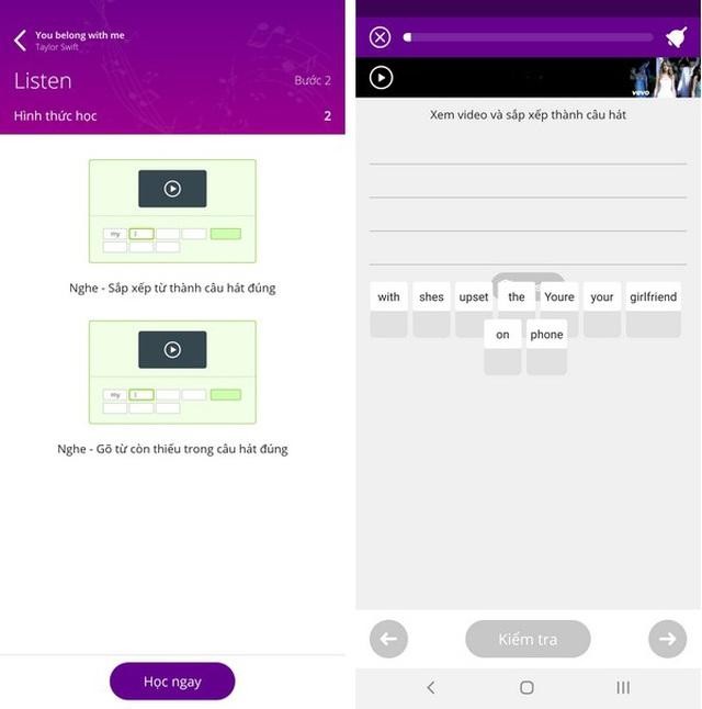 Tại phần học nghe, người dùng sẽ phải nghe một câu hát, sau đó phải sắp xếp lại các từ được cho sẵn thành một câu hoàn thiện, hoặc phải điền những từ còn thiếu vào chỗ trống.