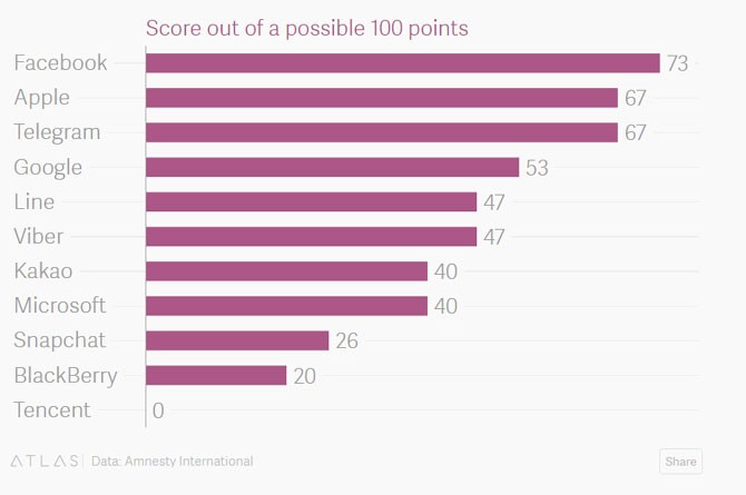 Tổ chức Ân xá quốc tế (Amnesty International) đã tiến hành đánh giá 11 công ty đứng sau các dịch vụ nhắn tin phổ biến nhất thế giới, để xem xét ứng dụng nhắn tin nào an toàn nhất, và các công ty này sử dụng mã hóa như thế nào nhằm bảo vệ sự riêng tư của người dùng.