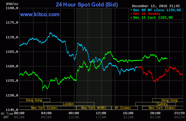 Chốt phiên giao dịch đầu tuần (Thứ Hai ngày 12/12), giá vàng giao Tháng Hai trên sàn Comex tại Sở giao dịch New York Mercantile đảo chiều nhích nhẹ $3,90 (+0,3%) lên đóng cửa ở $1.165,80/oz – đánh dấu phiên tăng giá đầu tiên sau 3 phiên suy liên tiếp. Lưu ý là trước đó trong phiên, đã có những thời điểm giá kim loại quý này còn rơi xuống mốc $1.152,50/oz.