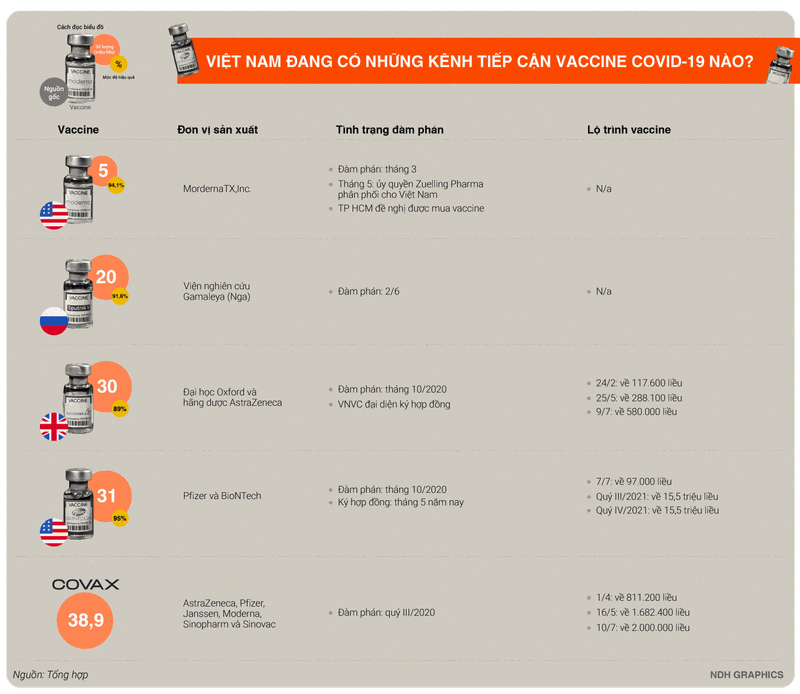 Những tháng đầu năm 2020, Bộ Y tế đã được giao nhiệm vụ tiếp xúc với tất cả những công ty có tiềm năng sản xuất vaccine Covid-19 trên thế giới để đàm phán mua, nhập khẩu vaccine hoặc nhận chuyển giao công nghệ nhằm tăng độ bao phủ tiêm chủng cho người dân nhanh và sớm nhất. Sau 200 buổi trao đổi, làm việc, đàm phán với các tổ chức, nhà sản xuất vaccine của Bộ Y tế, dự kiến Việt Nam có gần 130 triệu liều vaccine trong năm nay. Trong đó, 38,9 triệu liều được phân phối miễn phí thông qua COVAX, 86 triệu liều vaccine còn lại Việt Nam đàm phán mua của Pfizer/BioNtech (31), AstraZeneca (30), Sputnik V (20) và Moderna (5). Ngoài ra, Việt Nam còn có 2,5 triệu liều vaccine được tài trợ từ Nhật Bản và Trung Quốc.