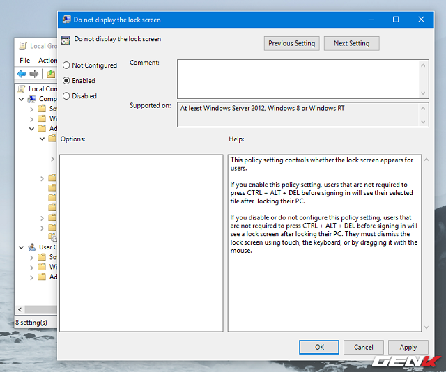 Hộp thoại cấu hình của tùy chọn này sẽ xuất hiện, bạn hãy đánh dấu vào tùy chọn Enabled và nhấn Apply -> OK để lưu lại, sau đó đóng hộp thoại Local Policy Editor lại.
