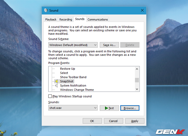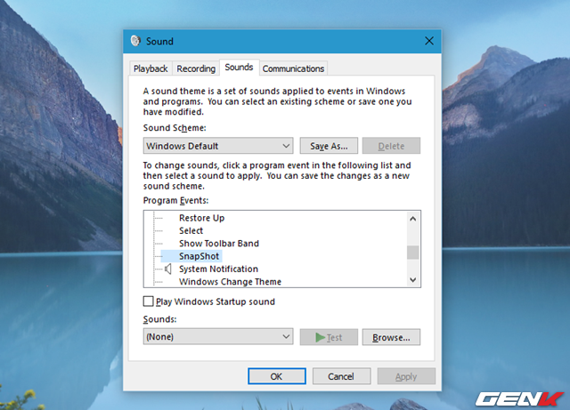 Hộp thoại Sounds xuất hiện, bạn hãy tìm đến tùy chọn SnapShot trong Program Events, nhấn chọn nó và nhấp Browse…