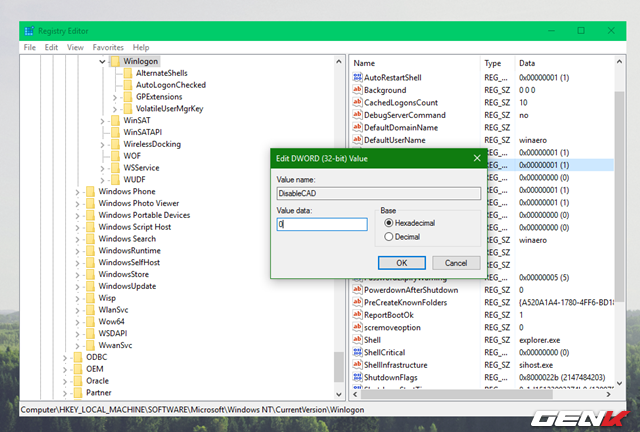 Nhấn phải chuột vào khung bên phải của Winlogon và tạo một một DWORD 32-bit mới với tên gọi là “DisableCAD” và đặt giá trị cho nó là “0”, sau đó lưu lại là xong.