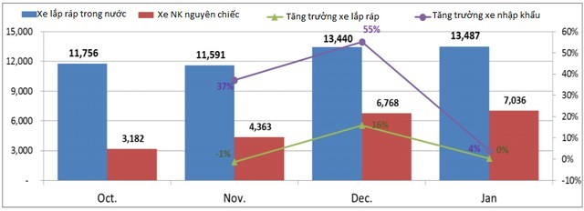 Tính đến hết tháng 1/2015, doanh số bán hàng của xe lắp ráp trong nước tăng 69% trong khi xe nhập khẩu tăng 110% so với cùng kì năm ngoái.