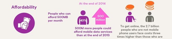 Thu nhập tăng và giá thiết bị ngày càng rẻ đang giải quyết ít nhiều vấn đề này, khi “trong năm 2014, các gói cước 500MB đã có thêm hơn 500 triệu người dùng tại các khu vực đang phát triển”. Nhưng nhiều người vẫn phải dùng chung gói cước - dường như nhiều gia đình vẫn chỉ đủ tiền cho 1 thiết bị, trong khi các khu vực nghèo nhất hầu như không có smartphone.