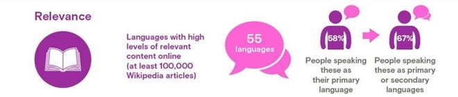 Cũng theo báo cáo, Google Android chỉ hỗ trợ 76 ngôn ngữ, và Facebook là 139. Nghĩa là Facebook chỉ có thể tiếp cận đến 83% người dùng biết 2 ngôn ngữ, và họ cần đến 800 ngôn ngữ để tiếp cận 98% người dùng.