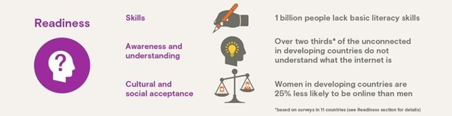 Giá cước cũng là vấn đề lớn. Báo cáo cho thấy gần 30% dân số ở các nước đang phát triển vẫn đang sống dưới mức nghèo, và 2 tỷ người không đủ khả năng chi trả cho 500MB dữ liệu Internet mỗi tháng.