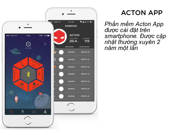 ACTON App là phần mềm đi cùng với ván trượt, kết nối từ điện thoại smartphone với các thiết bị Acton Blink của bạn. Bằng ứng dụng này, người dung có thể truy cập vào hệ thống của Acton App và nâng cấp các tính năng để nâng cao trải nghiệm lướt trên ván trượt. Đối với các sản phẩm như BlinkBoard ™ và BlinkLite ™, Acton App cung cấp các tùy chọn như thay đổi chế độ hoạt động của hệ thống điều khiển, kiểm tra cấp độ nạp của pin .v.v