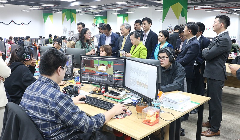 Chủ tịch Hội Truyền thông số Việt Nam, ông Nguyễn Minh Hồng (ở giữa), đang lắng nghe phần giới thiệu về các khâu sản xuất phim hoạt hình |