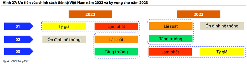 Năm 2023, VDSC cho rằng ưu tiên của chính sách tiền tệ sẽ dịch chuyển theo hướng kiềm giữ đà tăng lãi suất trong nền kinh tế để hỗ trợ cho đà tăng trưởng kinh tế, đồng thời đảm bảo sự ổn định của hệ thống các ngân hàng.