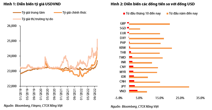 Trong báo cáo cập nhật biến động thị trường tiền tệ tháng 10/2022, CTCP Chứng khoán Rồng Việt (VDSC) đánh giá, tháng 10 vừa qua là một tháng đầy biến động của thị trường tiền tệ trong nước với câu chuyện lãi suất và tỷ giá.