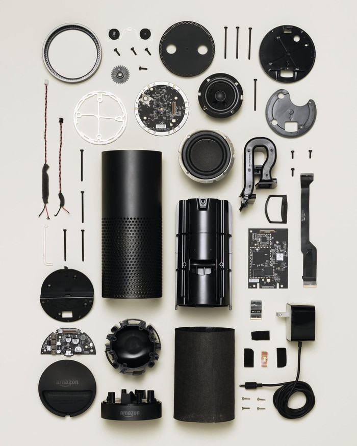 Nhiếp ảnh gia 42 tuổi tách từng linh kiện của thiết bị ra, sắp xếp chúng rất gọn gàng và chụp lại, giúp những người dùng khác thấy được thiết bị gồm những gì và hoạt động ra sao. Trong ảnh là loa thông minh Amazon Echo, ra đời năm 2014 với 50 linh kiện.