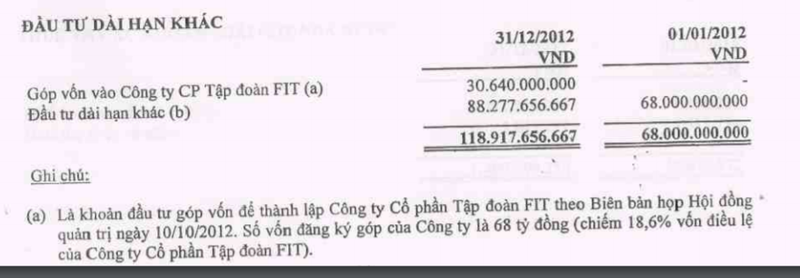 Theo đó, F.I.T đã thuyết minh về khoản góp vốn trị giá 30,64 tỷ đồng vào CTCP Tập đoàn FIT tại thời điểm 31/12/2012 như sau: “Là khoản đầu tư góp vốn để thành lập CTCP Tập đoàn FIT theo Biên bản họp Hội đồng quản trị ngày 10/10/2012. Số vốn đăng ký góp của Công ty là 68 tỷ đồng (chiếm 18,6% vốn điều lệ của CTCP Tập đoàn FIT).”
