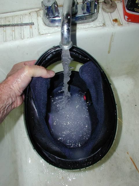 Với lớp bọc không tháo được, chúng ta cần tháo mọi phụ tùng gắn trên mũ như: kính xe, mái che (nếu có). Kế đến, chuẩn bị xô nhựa với dung tích có thể đặt vừa mũ bảo hiểm, vẫn sử dụng nước ấm và dầu gội đầu. Nhúng mũ bảo hiểm và dùng ngón tay chà xát phần lót bọc bên trong.