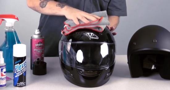 Sử dụng khăn mềm thấm xà phòng nhẹ nhàng lau qua một lượt bên ngoài mũ bảo hiểm để tránh làm xước. Với những mũ bảo hiểm gắn kính, sử dụng bàn chải đánh răng nhẹ nhàng gẩy bụi bẩn ra khỏi các lỗ bắt ốc.