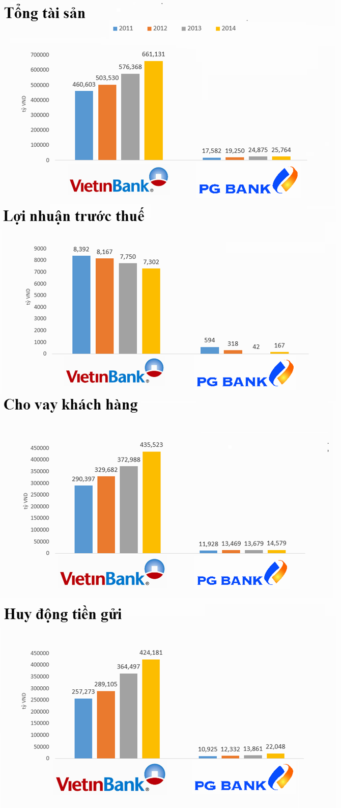Trong khi đó, tại Đại hội diễn ra ngày mai của ngân hàng PGBank, PGBank sẽ xin thông qua chỉ tiêu lợi nhuận trước thuế tăng 5% lên 176 tỷ đồng trong năm 2015; tổng tài sản tăng 16%. Dư nợ tín dụng tăng 7%, đạt 15.600 tỷ đồng; huy động vốn tăng 9% lên 23.981 tỷ đồng.