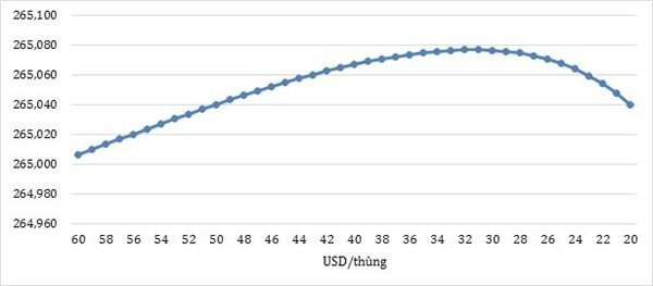 Mối quan hệ giữa giá dầu và thu thế VAT thể hiện mối quan hệ phi tuyến. Doanh thu thuế VAT đạt cực đại ở mức giá 32 USD/thùng và có chiều hướng sụt giảm nếu giá dầu tiếp tục giảm sâu.