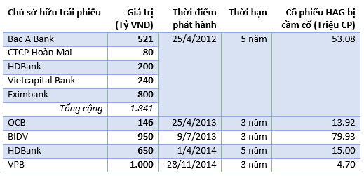Các trái phiếu này được phát hành từ giữa năm 2012 đến cuối năm 2014, trong phần lớn thời gian này giá HAG luôn ở trên mức 20.000 đồng/ cổ phiếu. Điều này có nghĩa là ở mức giá HAG hiện tại, giá trị các tài sản bảo đảm bằng cổ phiếu này đã giảm ít nhất 20%.
