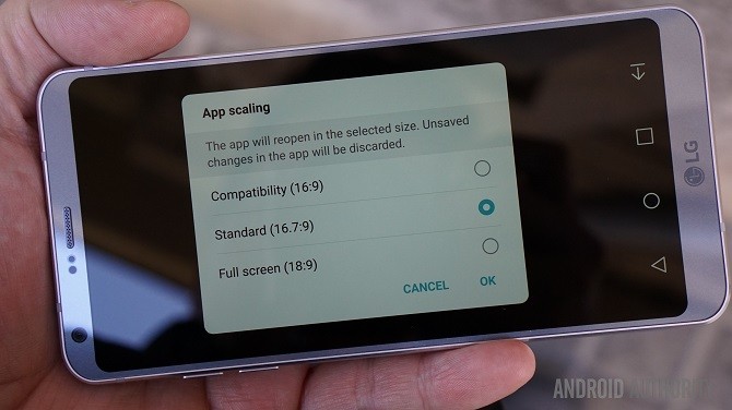 Hầu hết ứng dụng đều không gặp vấn đề gì với màn hình 18:9 trên G6 vì nó có thể tự kéo dài ra cho đầy màn hình. Đối với các ứng dụng chạy toàn màn hình, LG hỗ trợ tính năng App scaling cho phép lựa chọn tỉ lệ phù hợp để chạy ứng dụng đó (16:9, 16.7:9 hoặc 18:9) bằng cách vuốt từ trên xuống.