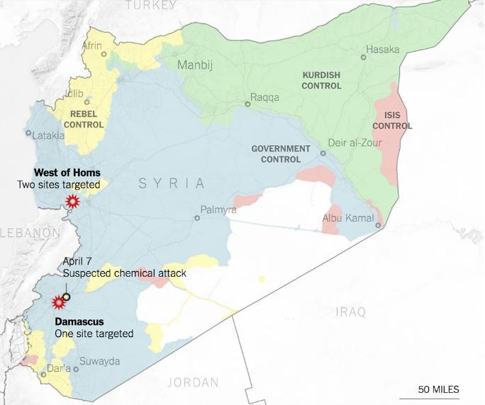 Tối ngày 13/4 (theo giờ địa phương), Tổng thống Mỹ đã có bài phát biểu về "sự kiện tấn công vũ khí hóa học ở Syria", tuyên bố Mỹ đã cùng Anh và Pháp tiến hành tấn công chính xác đối với các cơ sở quân sự của Syria.