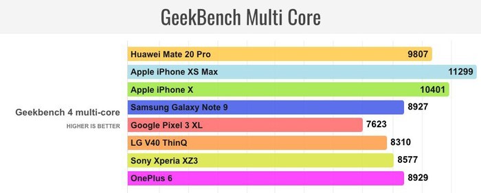 So sánh số điểm đa lõi GeekBench giữa các vi xử lý không cho thấy sự khác biệt nhiều. Cụ thể, Huawei Mate 20 Pro đạt 9.807 điểm, trong khi iPhone XS Max ghi được 11.299 và iPhone X đạt 10.401.