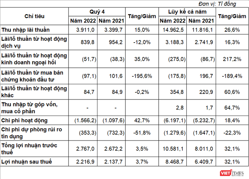 Trong năm 2022, thu nhập lãi thuần của VIB tăng trưởng tới 26,6% so với cùng kỳ năm trước, đạt 14.962,5 tỉ đồng. Bên cạnh đó, VIB cũng ghi nhận lãi từ hoạt động dịch vụ tăng trưởng 16,3%, đạt 3.188,3 tỉ đồng. Nguyên nhân chủ yếu từ tăng thu dịch vụ thanh toán (+69,1%) và giảm chi phí dịch vụ hoa hồng bảo hiểm (-90%).