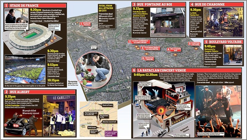 Chuỗi sự cố khủng bố theo thời gian: 8 chiến binh khủng bố đã tấn công sát hại 129 người, 349 người bị thương