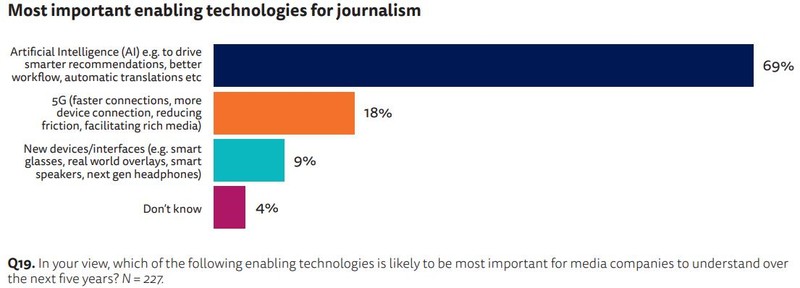 Đa số những người được hỏi (69%) cho AI là động lực lớn nhất cho báo chí trong vài năm tới, tiếp theo là 5G (18%) và các thiết bị mới (9%).