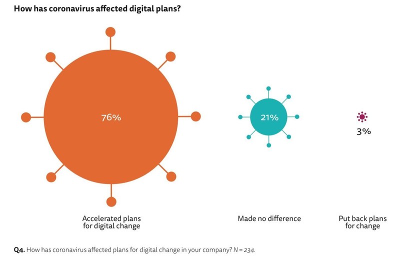 Theo báo cáo, có đến 76% trên tổng số người được hỏi đã thừa nhận rằng đại dịch Covid-19 đã đẩy nhanh mong muốn và kế hoạch chuyển đổi số của họ. Các chiến lược kinh doanh về cơ bản sẽ bao gồm những thay đổi đối với phương thức làm việc, mô hình kinh doanh hay cách các công ty truyền thông nghĩ về sự cách tân, đổi mới.