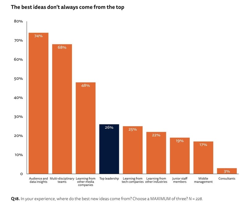 74% người tham gia khảo sát của Viện Reuters cho biết, những ý tưởng cách tân tuyệt vời nhất của họ đến từ những hiểu biết về độc giả và dữ liệu. Các nhà lãnh đạo cấp cao nói rằng, giờ đây, đóng góp của họ trong việc tạo ra các ý tưởng mới chỉ chiếm một phần rất hạn chế và chủ yếu, họ chỉ đứng ra tạo điều kiện thuận lợi cho những người khác phát triển các ý tưởng sáng tạo với sự trợ giúp của dữ liệu.