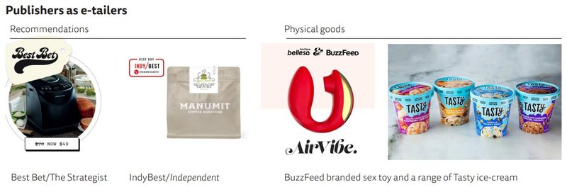 Nhìn chung, các tổ chức báo chí xây dựng các sáng kiến thương mại điện tử của họ chủ yếu xoay quanh việc quản lý nội dung và họ nhận được hoa hồng từ việc mua bán, như những gì mà Wirecutter, trang web đánh giá sản phẩm thuộc sở hữu The New York Times, The Strategist của Tạp chí New York/Vox Media và IndyBest của The Independent đang làm.